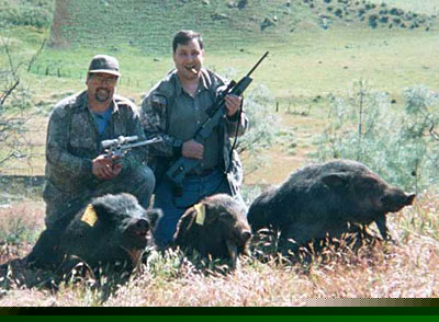 The hunt was fantastic!!! Mark is an excellent guide and he worked very hard for us to get our hogs. This was actually the second trip up to hunt with Mark as the first trip had to be cut short due to unexpected circumstances. We rescheduled the hunt for the last weekend in April 2001. The pigs were all in great shape, fat and extremely good eating. The barley was waist-high on the property we hunted. I hunted with a graduate from my hunter safety classes, which I teach about 6-8 times a year, and another hunter who was from Alaska and happened to be working south of San Francisco. We all scored on some nice hogs we estimated their weights from 150 to 300 pounds.