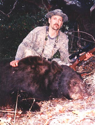 While hunting last October in the last week of deer hunting season in Mendocino County, my hunting buddy Mario and I saw this bear feeding on acorns. From a distance of about 75 yards, I sat and watched this guy to see if I should take him. Being that we had just arrived in our hunting area and Mario was pursuing deer as his main quarry, I asked if he had any objections to me "riling up" the resident deer by busting this big boy. He told me to take a shot as this was a good-size bear. Now, never ever seeing a bear for more than a fleeting moment, I was amazed this old boy had not winded or seen us as we watched him for more than a minute and a half. Well, I shot and the old boy went about 100 yards. He measured 5 feet 2 inches from nose to tail. Packing it out was no easy chore uphill 1900 feet in only 1.55 miles. Looking back, it was a great experience and well worth the humps to pack it out. The head and hide seemed to weigh 500 pounds alone! I estimated his weight at 300 pounds, but I'll never know as he was carried out in pieces. P.S. Mario and I saw over 12 bears in four days, with this one and one other being the biggest. Also, the bear I took had had his share of battles although not visible in this picture, his bottom canine was broken off at the gum line. His lip had been ripped and had healed awkwardly, leaving its lip permanently disfigured. Although he was big, a bigger bear had beaten the boy, but good! Oscar Ramirez |