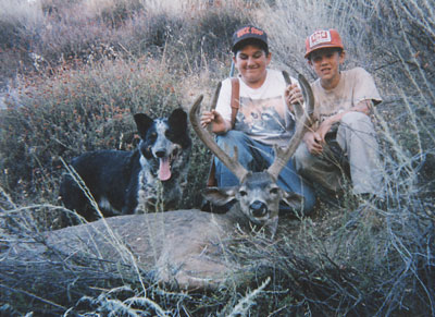 Tom Navarro shows off his first buck, and what a great buck it is! The buck's rack was 20 5/8 inches wide and 18 inches tall. The buck was a 3x3 with double eyeguards. Tom took his buck with a .243 at 95 yards while hunting California's A Zone during the 2002 season.